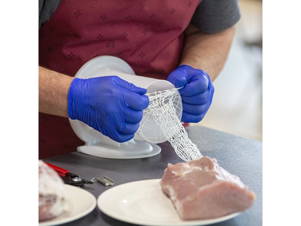 Nasaďte uzenářskou síť na aplikátor, zajistěte její konec a jednoduše protlačte maso nebo sýr dovnitř. Síť se rovnoměrně napne a vaše výrobky budou připravené k dalšímu zpracování rychleji a čistěji.