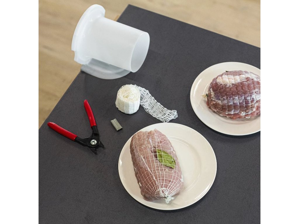 - Na šunku, vepřovou panenku, vepřovou krkovičku– usnadňuje vkládání masa do síťky před dalším zpracováním, např. pečením nebo uzením.
