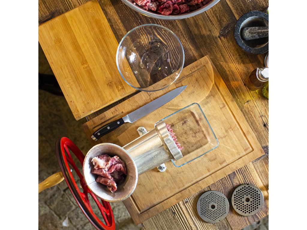 Zum Lieferumfang gehören drei Lochscheiben mit Durchmessern von 3, 5 und 8 mm, mit denen Sie die ideale Mahlfeinheit wählen können. Ebenfalls enthalten sind ein Messer aus Edelstahl, ein Quetschwerk und ein Satz Wurstfülltrichter (15, 19 und 22 mm) für die Herstellung von Würsten, Blutwurst oder Presskopf.