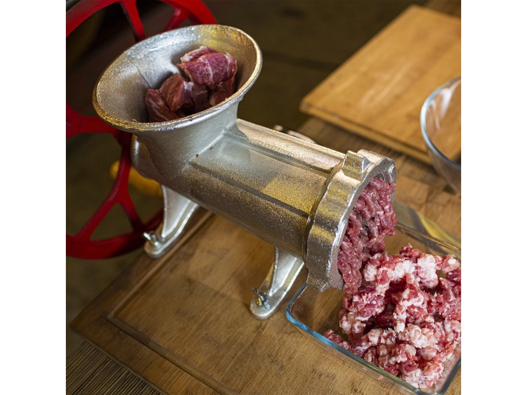 Robuster gusseiserner Fleischwolf und Wurstfüller #32 in einem. Im Lieferumfang enthalten sind ein Edelstahlmesser, ein Fleischwolfvorsatz, drei Lochscheiben (3 / 5 / 8 mm) und drei Wurstfüllröhrchen. Anschluss eines Niedrigdrehzahlmotors möglich. Perfekt für die hausgemachte Herstellung von Würsten, Hackfleisch und Räucherwaren.