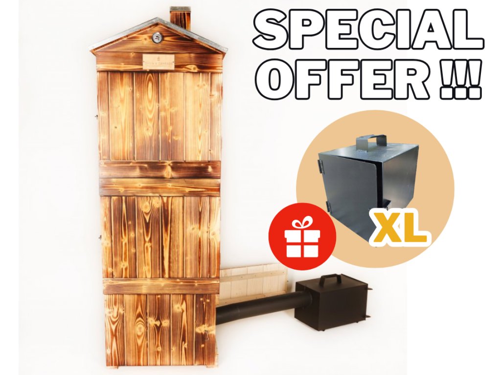 Představujeme vám NAŠI NEJVĚTŠÍ dřevěnou udírnu. Udírna se skládá ze 3 hlavních částí, je opálená, impregnovaná a má oplechovanou stříšku. Tahle udírna je pro ty, kteří chtějí vyudit až 30 kilo masa.