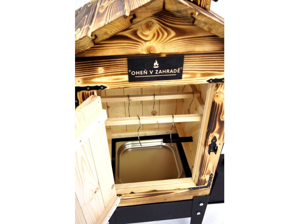 Ocelová základna je stabilní a dlouhodobě odolná vůči teplu. Na podstavci jsou madla, která umožňují přenášení celé udírny.