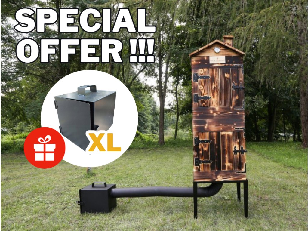 Our wooden smoker with fittings - XXXL charred impregnated - complete double smoker including firebox and all accessories.