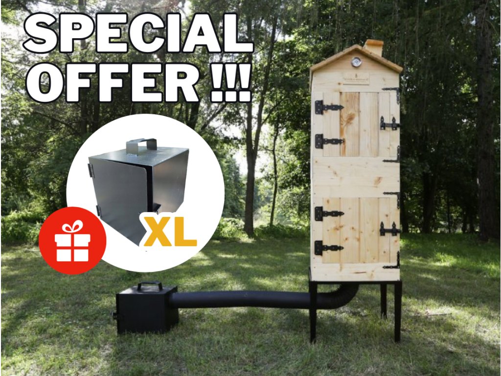 Our wooden smoker with fittings - XXXL unburnt impregnated - complete double smoker including firebox and all accessories.