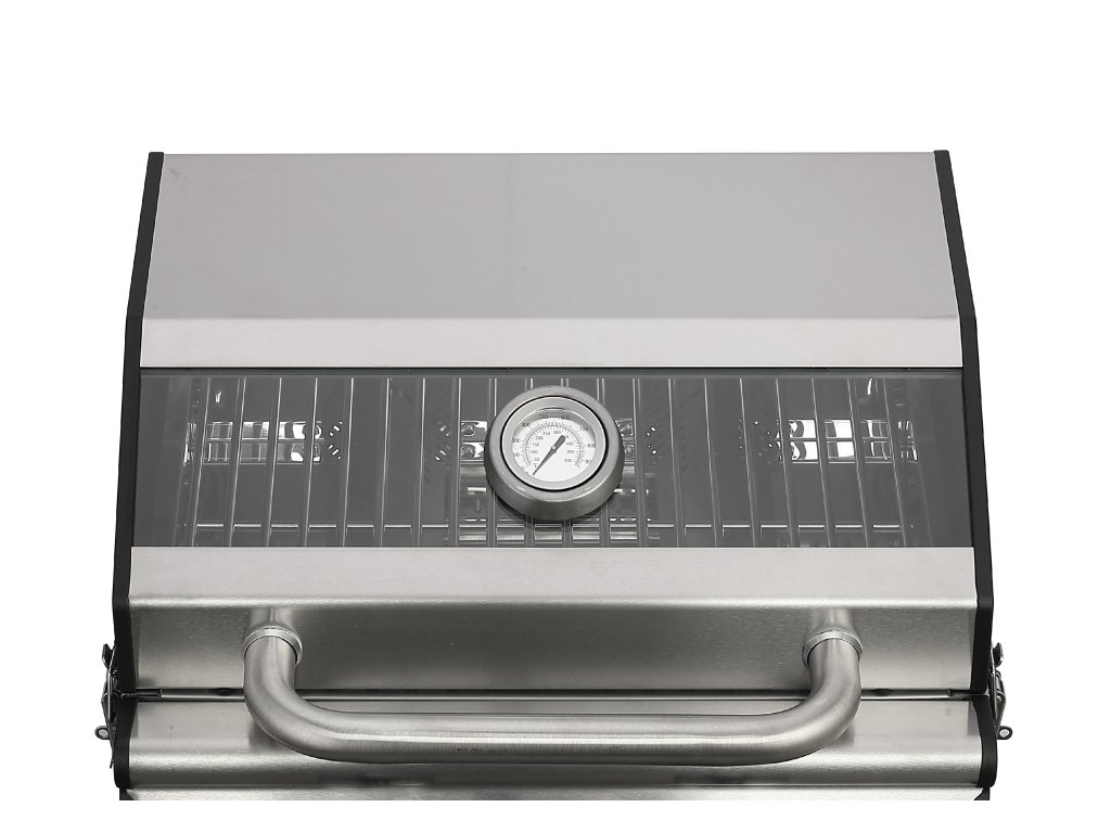 Kompakt méretének köszönhetően a grill alkalmas erkélyeken, teraszokon és utazás közben is. A vasöntvény rács kiválóan elosztja a hőt, és tökéletes átsülést tesz lehetővé felesleges odaégés nélkül. A rozsdamentes acél égők egyenletes égést és a hőmérséklet pontos beállítását biztosítják az elkészítendő ételeknek megfelelően.
