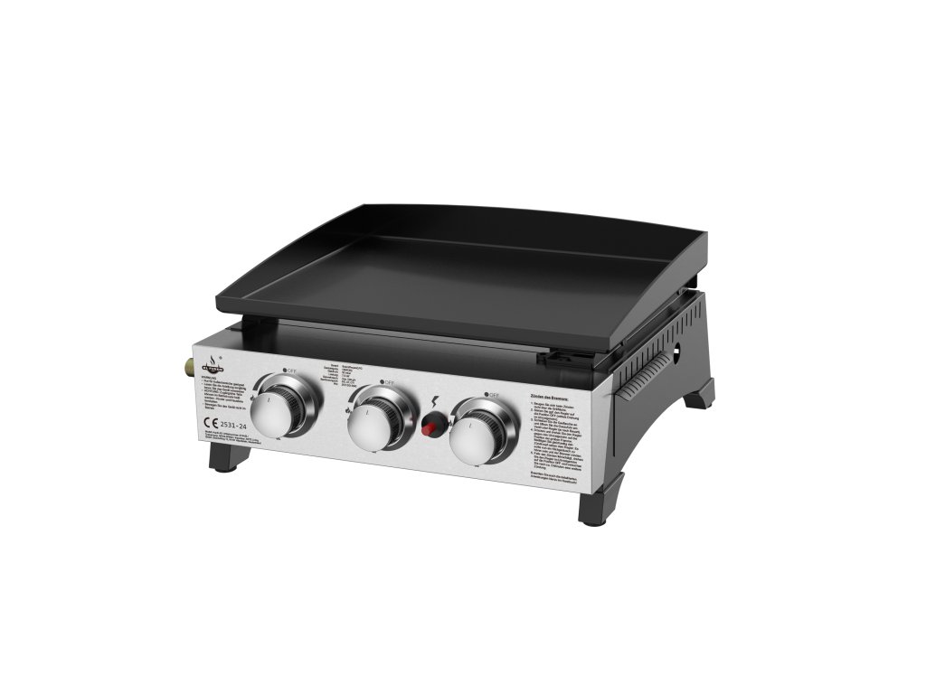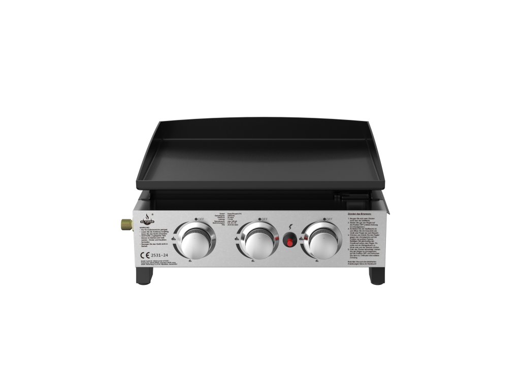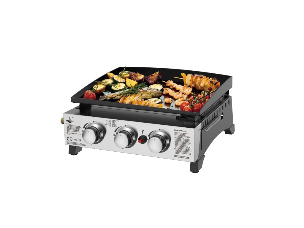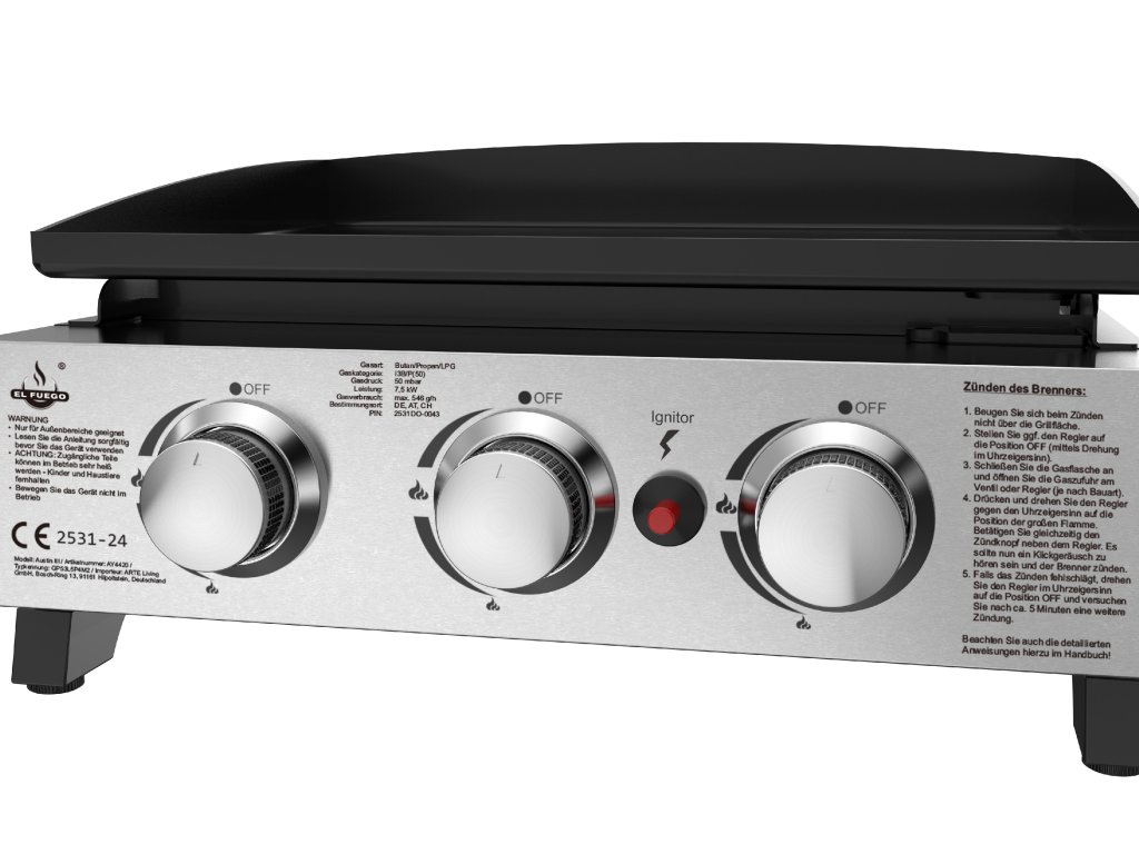 Az El Fuego® Planchagrill „Austin III“ autentikus spanyol grillezési élményt hoz közvetlenül a konyhájába vagy a teraszára. A nagy teljesítményű égőknek és a minőségi öntöttvas grilllapnak köszönhetően egyenletes átsülést biztosít a húsoknak, halaknak és zöldségeknek, miközben az ételek belül szaftosak és ízletesek maradnak. Édességek készítéséhez is ideális.