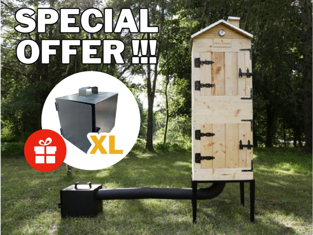 Vă prezentăm afumătoarea noastră frumoasă, mare, din lemn, cu două camere, cu feronerie și acoperiș placat cu tablă, pentru cei care doresc să lase afumătoarea mai mult afară.