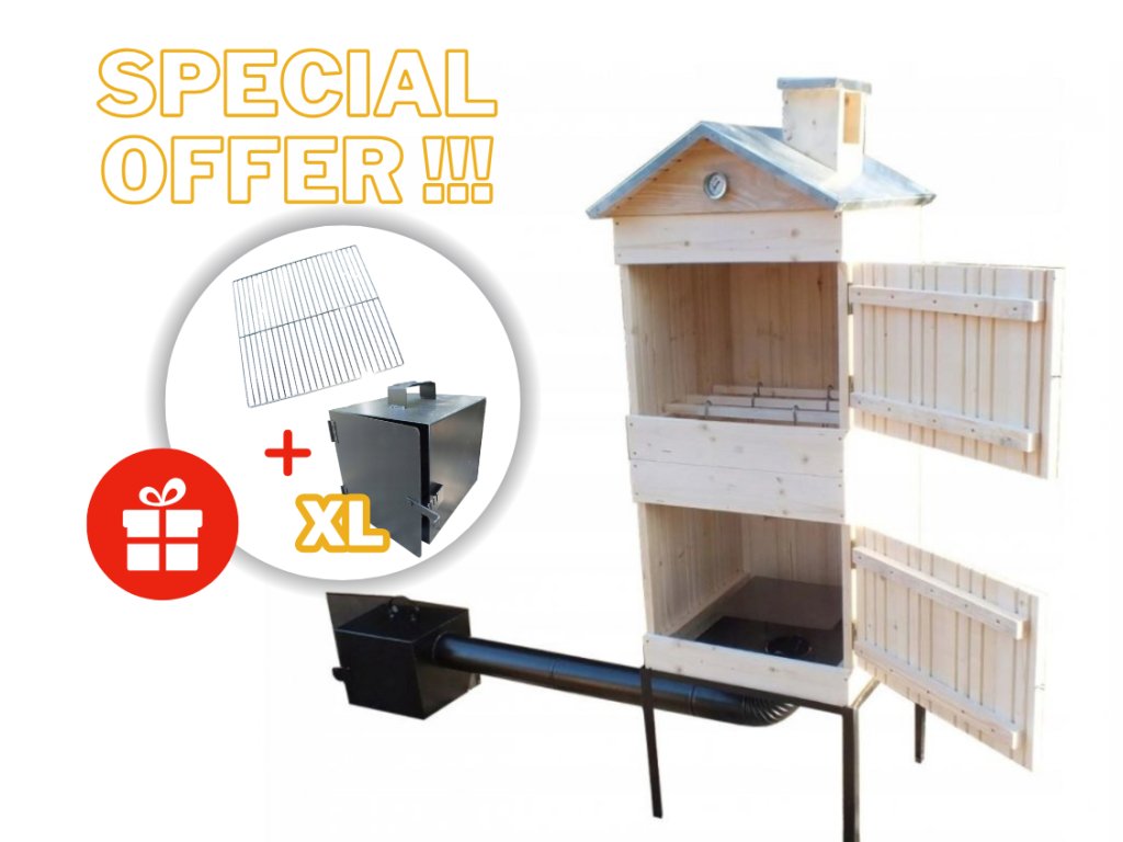 Vă prezentăm frumosul nostru kafumătoare mare din lemn, cu două compartimente, cu feronerie și acoperiș din tablă pentru cei care doresc să lase afumătoarea mai mult afară.